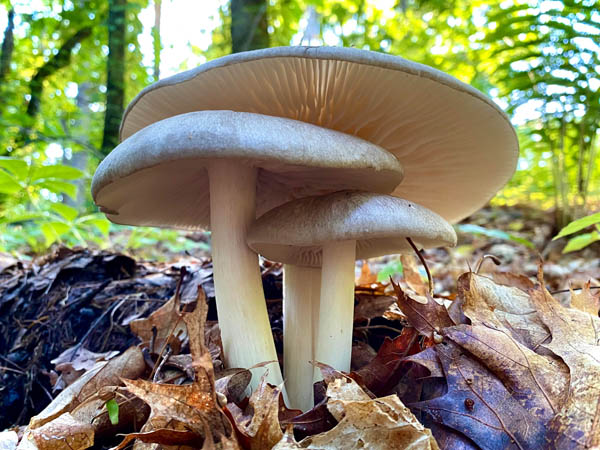 the season. It has a large grey cap and beautiful white gills that drape down like curtains. Platterfuls can be found on decayed hardwood or arise