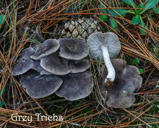a dark grey cap and white stem. Found under assorted conifers sometimes by the hundreds. Greys can be frozen for up to four